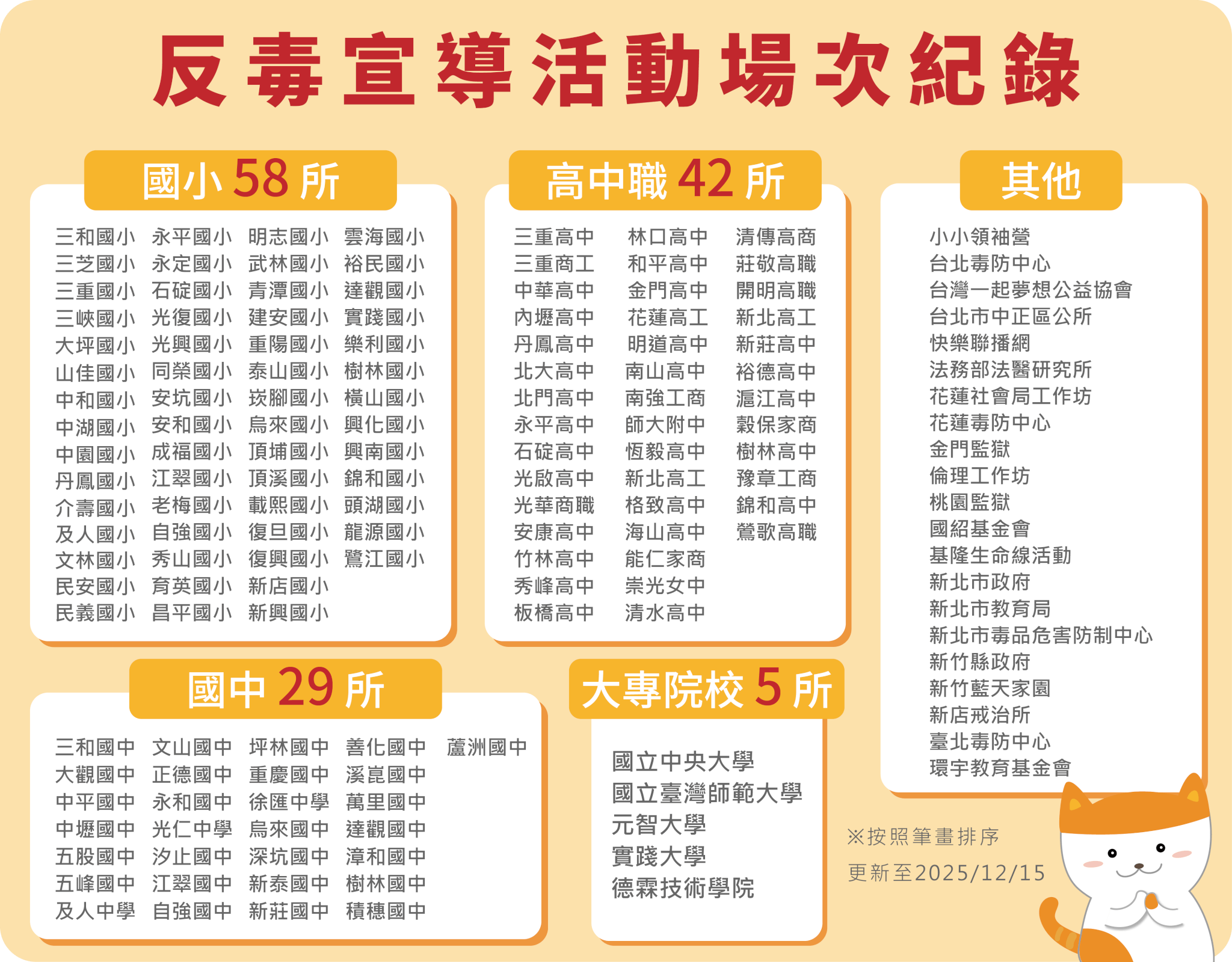 本會亦關注青少年常見成癮問題,於宣導內容納入:3C網路成癮、短影音沉迷、網路遊戲成癮等大腦酬賞機制破壞,並新增電子菸、依托咪酯與大麻等新興毒品議題,以更實用及有趣的方式與學生互動,引導學生建立正確的觀念。。